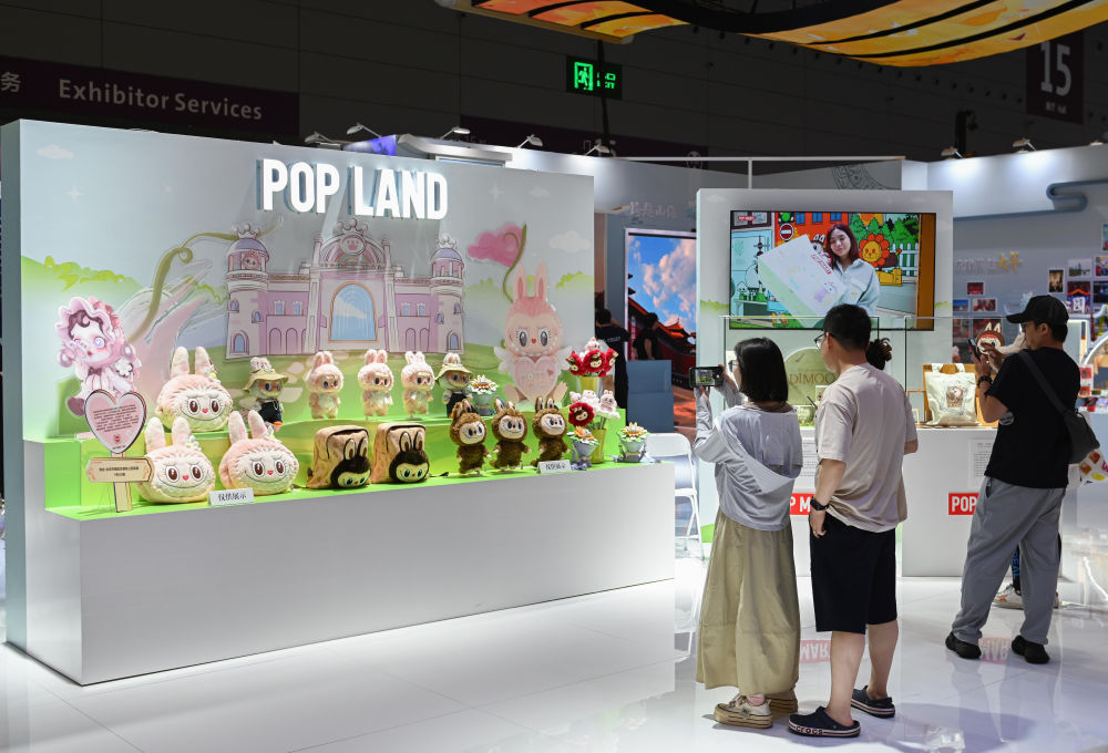5月24日,在文博会北京展区,观众在泡泡玛特城市乐园展台前拍照。新华社记者 肖恩楠 摄